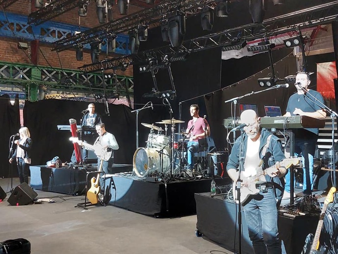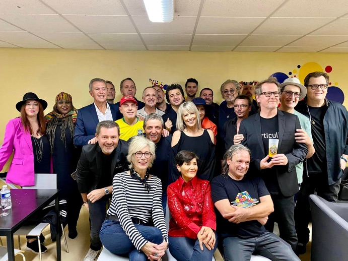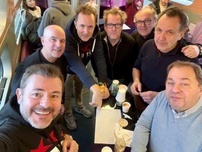 Christian de RafT avec Jérôme Anthony, Partenaire Particulier, JP Morgand, Alec Mansion et Olivier Kaefer (prod), Spectacle Totalement 80 (Quimper, le 4/2/23).
