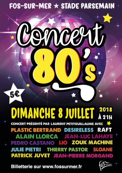 Concert 80‘s live avec Plastic Bertrand, Jean-Luc Lahaye, Patrick Juvet, Lio, Sloane, Desireless, Zouk Machine, JP Morgand (Les Avions), Thierry Pastor, Julie Pietri, Alain Llorca (Gold), Pedro Castano et Christian de Raft (Fos s/Mer, le 8 juillet 2018).